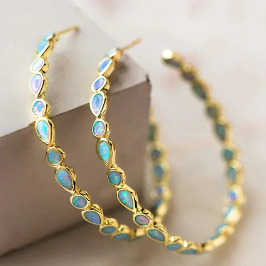 Elevate your accessory game with the Emmeline Earrings, where classic gold meets the dreamy shimmer of blue opal. These vintage-inspired hoops feature a creative round-ring design with a luminous opal inlay, perfect for adding a touch of sophistication and serenity to any look. Lightweight yet eye-catching, they’re ideal for both everyday wear and special occasions.